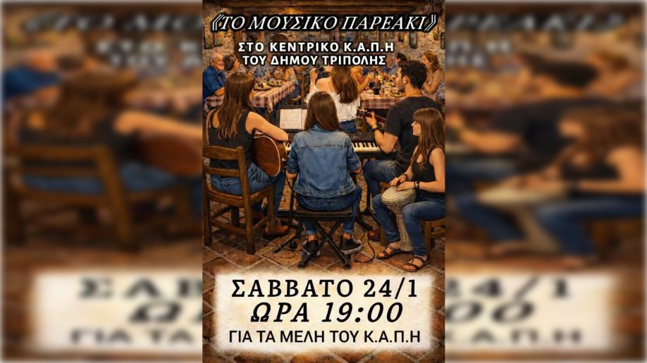 Το "Μουσικό Παρεάκι" παίρνει τα όργανα του, φοράει το πιο πλατύ χαμόγελο του, και έρχεται στο Κ.Α.Π.Η του δήμου Τρίπολης για να χαρίσει μια ρεμπέτικη μουσική βραδιά γεμάτη κέφι και τραγούδι. Όλοι οι συντελεστές, επιδιώκουμε να αποδείξουμε πώς η νέα γενιά κρατάει ζωντανές τις ρίζες της, γνωρίζει, αγαπάει και αναπαράγει την μουσική που μεγάλωσε τις προηγούμενες γενιές. Το χαμόγελό σας θα είναι η αμοιβή μας και η διασκέδαση σας μέλημά μας!