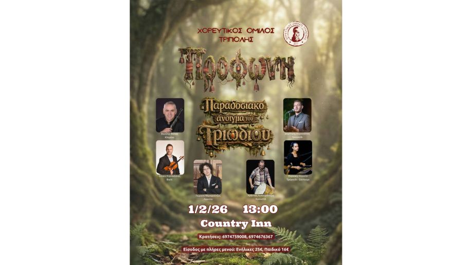 Παραδοσιακό γλέντι του Χορευτικού Ομίλου Τρίπολης για το άνοιγμα του Τριωδίου την Κυριακή 1 Φεβρουαρίου 2026 και ώρα 13:00.
