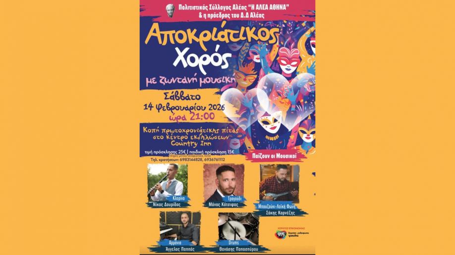 Ο πολιτιστικός σύλλογος Αλέας "Η ΑΛΕΑ ΑΘΗΝΑ " και η πρόεδρος του Δ.Δ. Αλέας σας προσκαλούν στον Αποκριάτικο χορό και στην κοπή πίτας που διοργανώνουν, το Σάββατο 14 Φεβρουαρίου 2026, στο κέντρο δεξιώσεων Country inn, στις 9:00 το βράδυ .