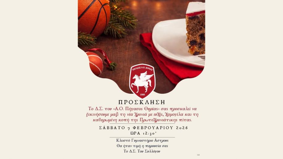 Το Δ.Σ. του «Α.Ο. Πήγασος Θυρέας» σας προσκαλεί να ξεκινήσουμε μαζί τη νέα χρονιά με ευχές, χαμογέλα και τη καθιερωμένη κοπή της Πρωτοχρονιάτικης πίτας τo Σάββατο 07 Φεβρουαρίου 2026 και 12:30’ ώρα στο Κλειστό Γυμναστήριο Άστρους.