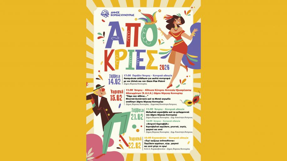 Ο Δήμος Βόρειας Κυνουρίας σας προσκαλεί και φέτος στις αποκριάτικες εκδηλώσεις για να ζήσουμε μαζί τη μαγεία της Αποκριάς! Μουσική, χορός, τραγούδι, γέλιο και νόστιμα εδέσματα για μικρούς και μεγάλους θα προσφέρουν μοναδικές στιγμές διασκέδασης και ξεγνοιασιάς.