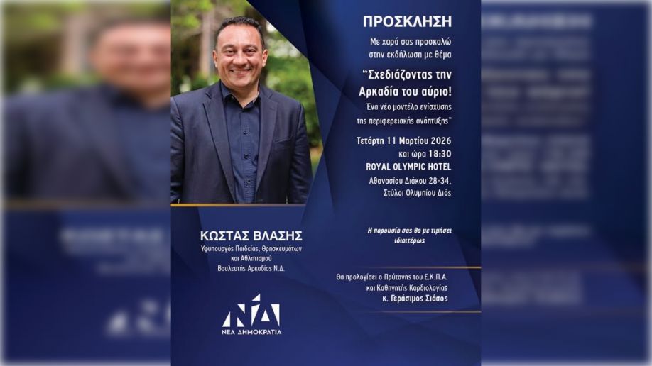 Την Τετάρτη 11/03/2026 στις 18:30 συζητάμε για την Αρκαδία μας σε μια εκδήλωση με θέμα: «Σχεδιάζοντας την Αρκαδία του αύριο. Ένα νέο μοντέλο ενίσχυσης της περιφερειακής ανάπτυξης».