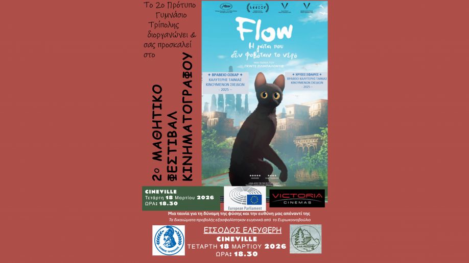 Οι μαθητές του Ομίλου CINEμάθεια του 2 ου Προτύπου Γυμνασίου Τρίπολης επιλέγουν, παρουσιάζουν και σας προσκαλούν στην προβολή της βραβευμένης ταινίας Animation «Flow. Η γάτα που δεν φοβόταν το νερό» (Βραβείο ΟΣΚΑΡ Καλύτερης Ταινίας Κινουμένων Σχεδίων).