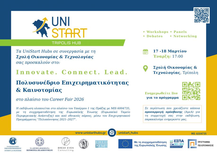 Την Τρίτη 17 και την Τετάρτη 18 Μαρτίου 2026, τα UniStart Hubs σε συνεργασία με την Break Even Consulting και τη Σχολή Οικονομίας & Τεχνολογίας του Πανεπιστημίου Πελοποννήσου σας προσκαλούν στο Πολυσυνέδριο Επιχειρηματικότητας & Καινοτομίας «Innovate. Connect. Lead.», το οποίο πραγματοποιείται στο πλαίσιο της Ημέρας Καριέρας – Career Fair της Σχολής. Η εκδήλωση θα πραγματοποιηθεί στις εγκαταστάσεις της Σχολής Οικονομίας και Τεχνολογίας του Πανεπιστημίου Πελοποννήσου στην Τρίπολη και απευθύνεται σε φοιτητές, αποφοίτους, νέους επιστήμονες, επιχειρηματίες, στελέχη επιχειρήσεων και επαγγελματίες που ενδιαφέρονται να εξερευνήσουν τις σύγχρονες εξελίξεις στην αγορά εργασίας, την επιχειρηματικότητα και την καινοτομία.