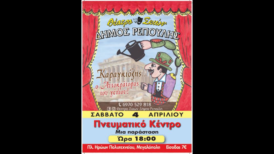 To Θέατρο Σκιών του Δήμου Ρεπούλη, έρχεται ΓΙΑ ΠΡΩΤΗ ΦΟΡΑ, για να σας παρουσιάσει, μια ξεκαρδιστική κωμωδία, από τα (ουκ ολίγα) κατορθώματα του γνωστού σε όλους μας Καραγκιόζη!