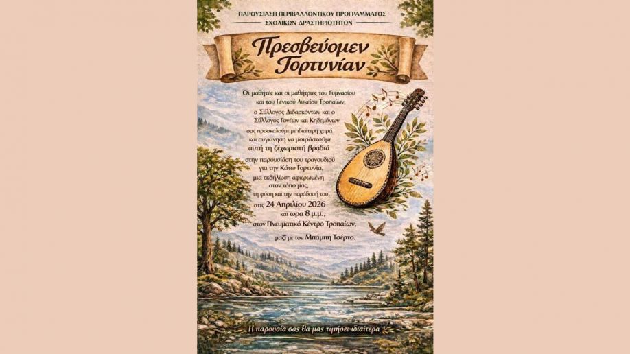 Η παρουσίαση του περιβαλλοντικού προγράμματος σχολικών δραστηριοτήτων με τίτλο «Πρεσβεύομεν Γορτυνίαν» διοργανώνεται από τους μαθητές και τις μαθήτριες του Γυμνασίου και του Γενικού Λυκείου Τροπαίων, τον Σύλλογο Διδασκόντων και τον Σύλλογο Γονέων και Κηδεμόνων, οι οποίοι σας προσκαλούν με ιδιαίτερη χαρά και συγκίνηση να μοιραστείτε μαζί τους αυτή τη ξεχωριστή βραδιά.