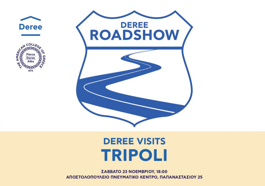 Το Deree πραγματοποιεί ενημερωτική εκδήλωση στην Τρίπολη, το Σάββατο 23 Νοεμβρίου, ώρα 18:00, στο Αποστολοπούλειο Πνευματικό Κέντρο, Παπαναστασίου 25. Εκεί θα έχεις την ευκαιρία να μιλήσεις με εκπροσώπους του Deree, φοιτητές και αποφοίτους, και να ενημερωθείς για όλα όσα αναδεικνύουν το Deree σε κορυφαία επιλογή σπουδών!