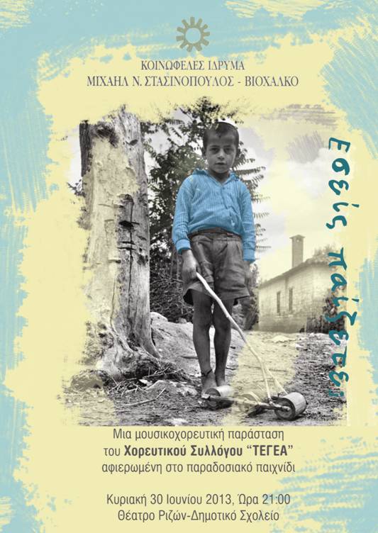 Μία μουσικοχορευτική παράσταση του Χορευτικού Συλλόγου «Τεγέα» αφιερωμένη στο παραδοσιακό παιχνίδι θα γίνει την Κυριακή 30 Ιουνίου, στις 9.00 το βράδυ, στο θέατρο Ριζών (δημοτικό σχολείο).