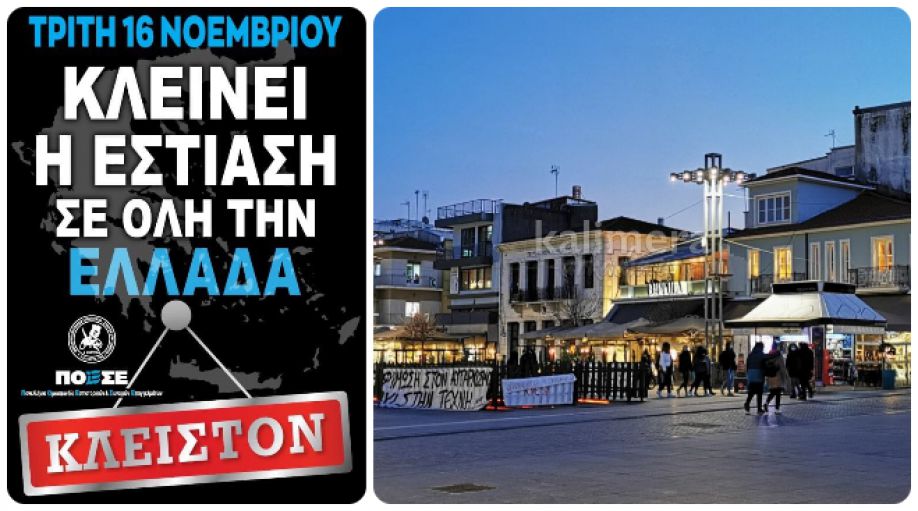 Την Τρίτη 16 Νοεμβρίου 2021 κλείνουν καφετέριες, εστιατόρια, ταβέρνες, όλα τα καταστήματα εστίασης στην Τρίπολη, την Αρκαδία και όλη την Ελλάδα, για 24 ώρες.