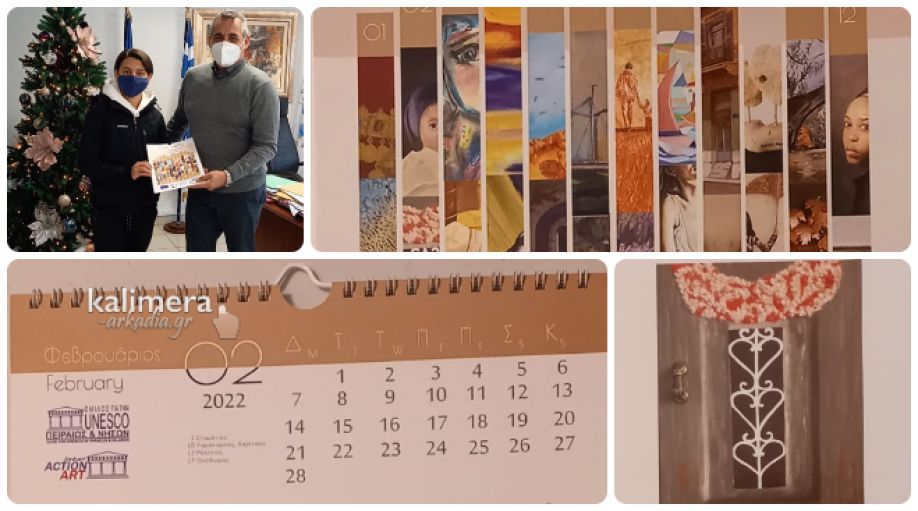 Ο νεαρός καλλιτέχνης από την Τρίπολη, Βασίλης Μανωλόπουλος, παρέδωσε στον Δήμαρχο κ. κώστα Τζιούμη, ημερολόγια 2022 της Unesco, μέσα στα οποία υπάρχει έργο του.