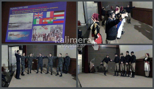 Στη συνέχεια, μία ομάδα νεοσυλλέκτων από την Κρήτη που υπηρετούν τη θητεία τους στην Τρίπολη, έπαιξαν και χόρεψαν Κρητικά τραγούδια.