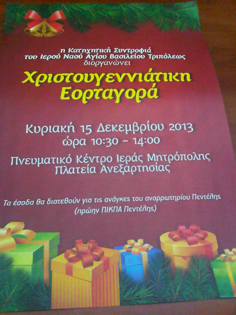 Χριστουγεννιάτικη εορταγορά διοργανώνει η Κατηχητική Συντροφιά του Μητροπολιτικού Ιερού Ναού Αγίου Βασιλείου Τριπόλεως, με δικές τους κατασκευές την Κυριακή 15 Δεκεμβρίου 2013, ώρα 10:30 - 14:00 στο Πνευματικό Κέντρο της Ιεράς Μητροπόλεως Μαντινείας και Κυνουρίας στην Πλατεία Εθνάρχου Μακαρίου (Ανεξαρτησίας).