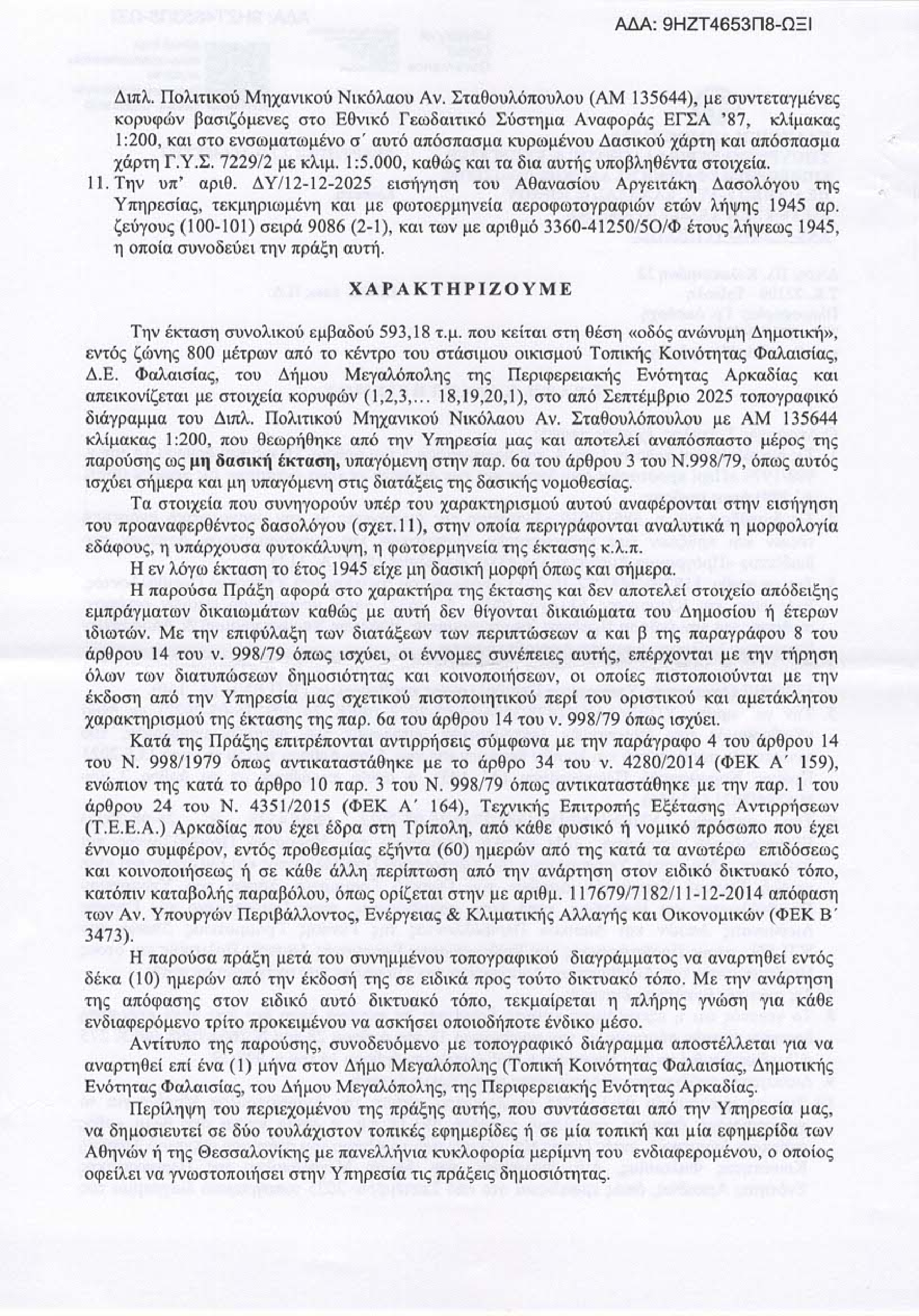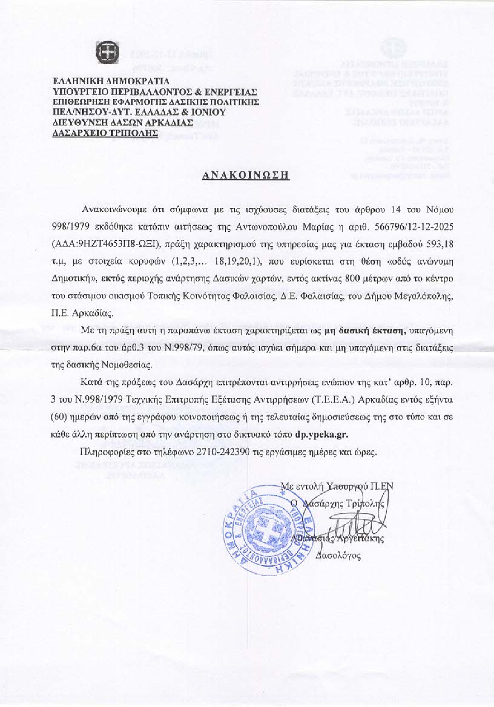 «Σε εφαρμογή των διατάξεων του άρθρου 14 του Ν. 998/1979, όπως ισχύει, δημοσιοποιείται η Πράξη χαρακτηρισμού του Δασάρχη Τρίπολης που αφορά έκταση εμβαδού 593,18 τ.μ., η οποία βρίσκεται στη θέση"οδός ανώνυμη Δημοτική", εκτός περιοχής ανάρτησης Δασικών χαρτών, εντός κτίνας 800 μέτρων από το κέντρο του στάσιμου οικισμού Τοπικής κοινότητας Φαλαισίας, του Δήμου Μεγαλόπολης Π.Ε. Αρκαδίας.