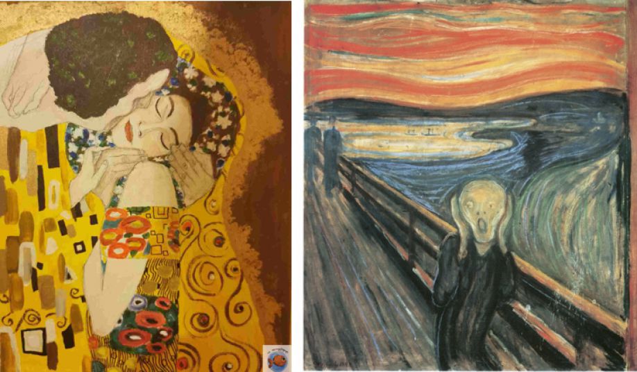 και τα εικαστικά έργα «Το φιλί», του Γκούσταβ Κλιμτ και «Η κραυγή» του Έντβαρντ Μουνκ,