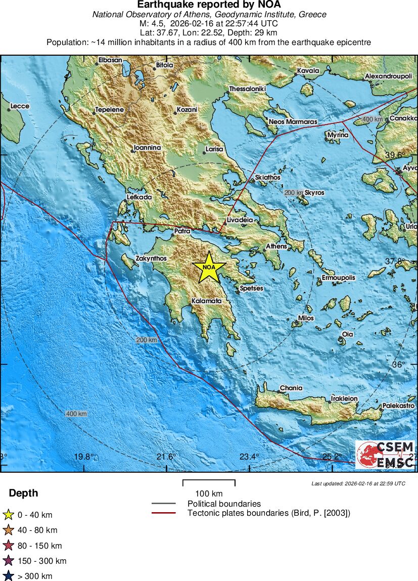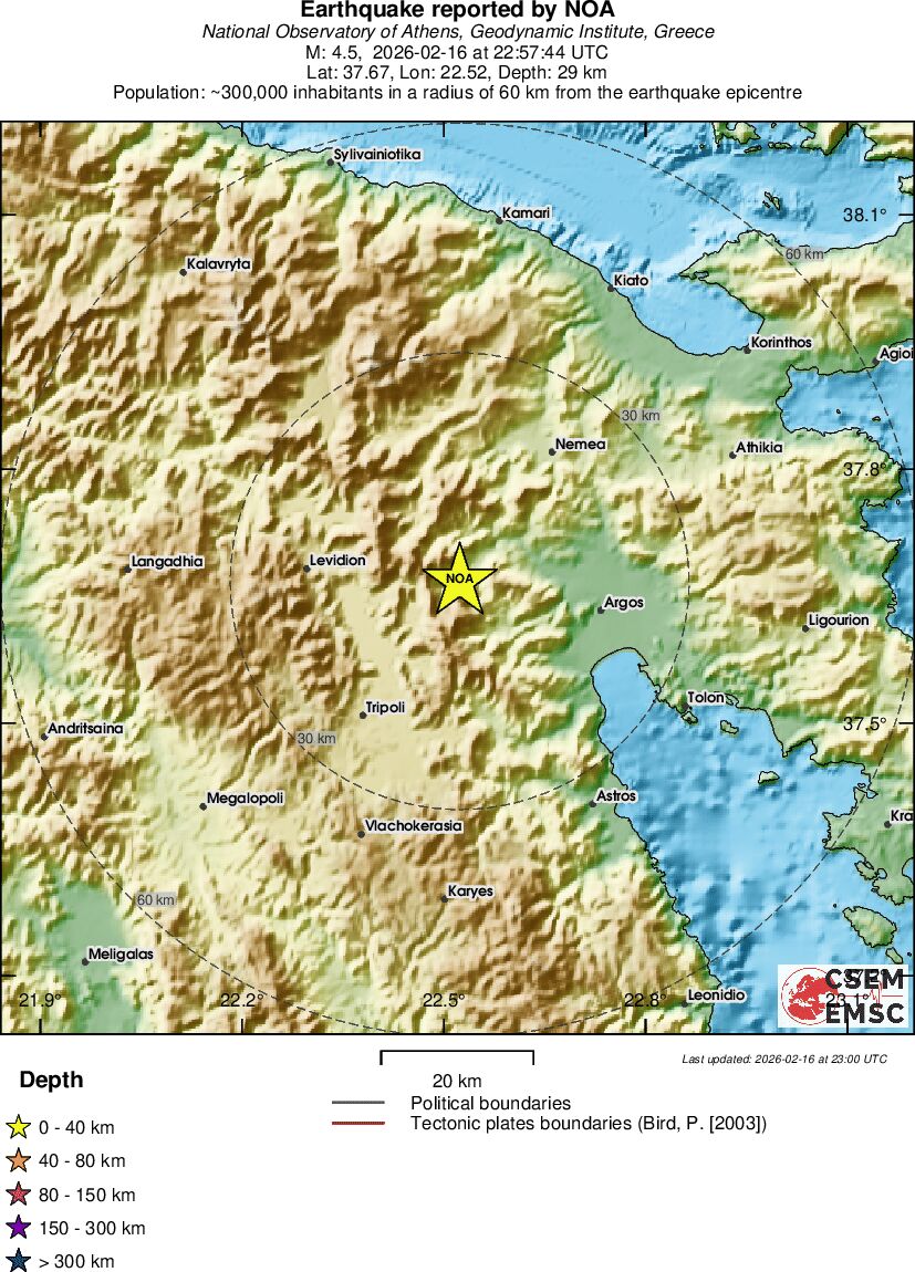 Ο σεισμός είχε εστικαό βάθος 29 χιλιόμετρο και το επίκεντρο υπολογίζεται κοντά στο Καπαρέλλι, στα σύνορα Αρκαδίας - Αργολίδας, περίπου 22 χιλιόμετρα μακριά από την Τρίπολη.
