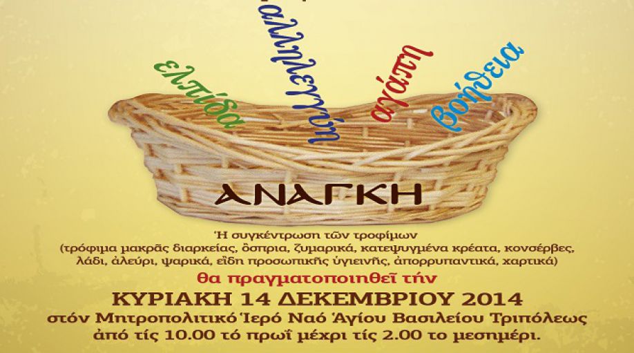 Ἡ συγκέντρωσις τῶν προσφορῶν αὐτῶν θά πραγματοποιηθῆ τήν Κυριακή 14ῃ Δεκεμβρίου 2014 στό Μητροπολιτικό Ἱερό Ναό Ἁγίου Βασιλείου Τριπόλεως (πλατεῖα Ἁγίου Βασιλείου Τριπόλεως στό ἰσόγειο ἔμπροσθεν τοῦ Ἱεροῦ Παρεκκλησίου τῆς Ἁγίας Μακρίνας) ἀπό τίς 10 τό πρωΐ μέχρι τίς 2 τό μεσημέρι.»