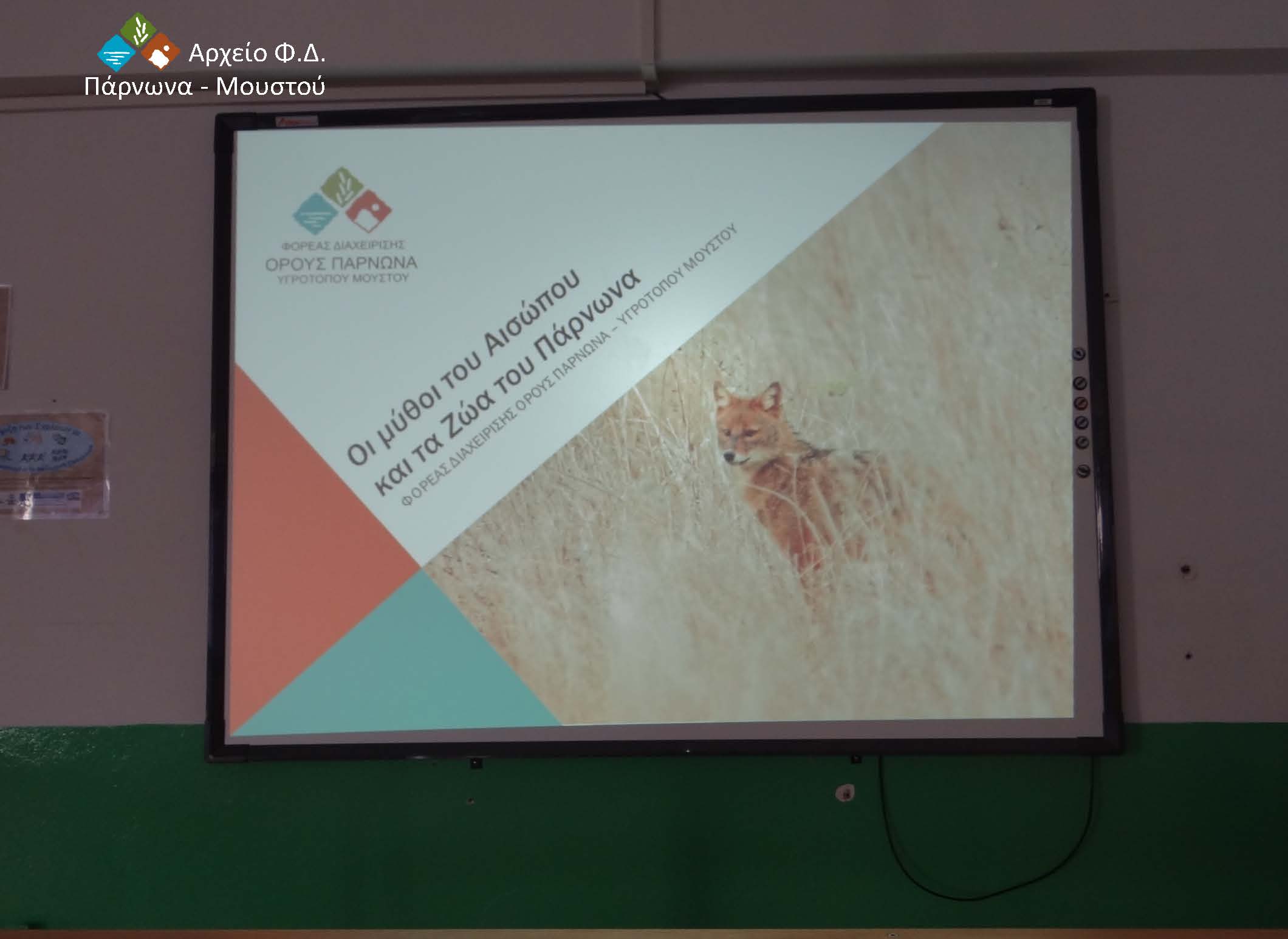 (12.10.2015) Στο Γυμνάσιο Παραλίας Τυρού προβλήθηκε η θεματική παρουσίαση «Καταφύγια άγριας ζωής στον Πάρνωνα». Την παρουσίαση παρακολούθησαν 26 μαθητές οι οποίοι ενημερώθηκαν κατά κύριο λόγο για τα 7 καταφύγια άγριας ζωής εντός της προστατευόμενης περιοχής και τη διαχείρισή τους σύμφωνα με την ισχύουσα νομοθεσία.