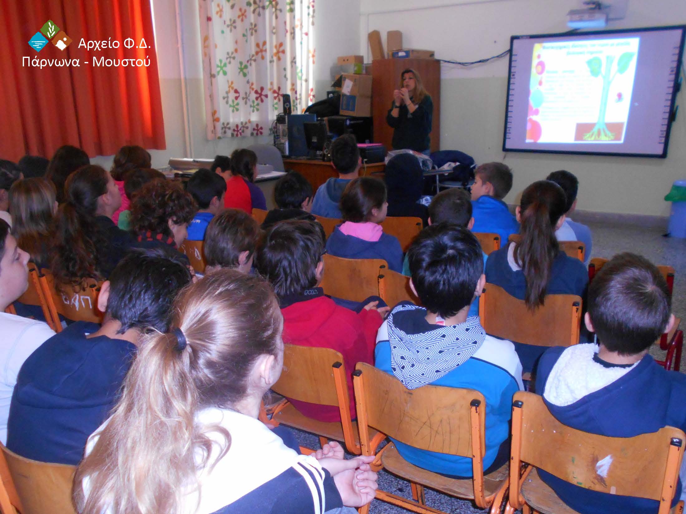 Η δεύτερη θεματική δράση αφορούσε σε επίσκεψη περιβαλλοντικής ενημέρωσης σε σχολική αίθουσα και συγκεκριμένα, στην αίθουσα προβολών του 5ου Δημοτικού Σχολείου Τρίπολης στις 02.02.2016, όπου οι σαράντα περίπου μαθητές της ΣΤ τάξης παρακολούθησαν με ιδιαίτερο ενδιαφέρον την προβολή με θέμα την «Αξία του Νερού». Οι ειδικά διαμορφωμένες διαφάνειες και το εύληπτο οπτικοακουστικό υλικό που παρουσιάστηκε, στάθηκε αφορμή για να γίνει, μεταξύ άλλων, αναφορά στην επιβεβλημένη ανάγκη για την ορθολογική διαχείριση και τη σωστή χρήση του νερού, των ιδιαίτερα ξεχωριστών φυσικοχημικών ιδιοτήτων του με μεγάλη βιολογική σημασία για τη ζωή στον πλανήτη, κ.α. Τέλος, έγινε αναφορά, στη μεγάλη οικολογική αξία του υδάτινου οικοσυστήματος του υγροτόπου Μουστού για τα υδρόβια και παρυδάτια είδη πτηνών, καθώς αποτελεί τη σημαντικότερη περιοχή για τη διαχείμασή τους στην Ανατολική Πελοπόννησο. Ενδιαφέρον είχε η συμμετοχή των μαθητών που καθ’ όλη τη διάρκεια ήταν ιδιαίτερα ενεργή.