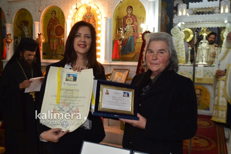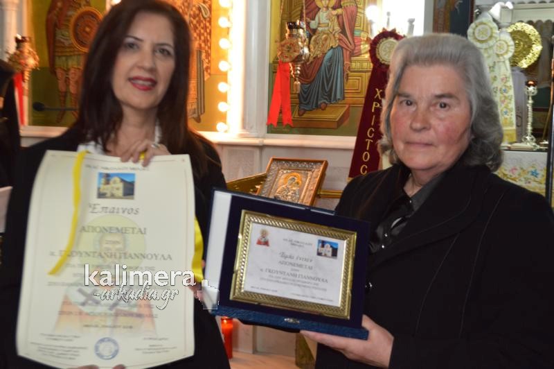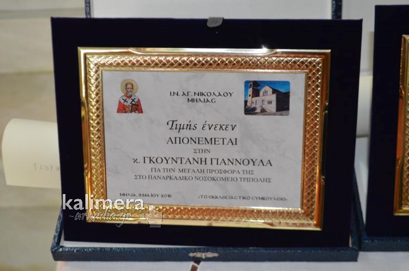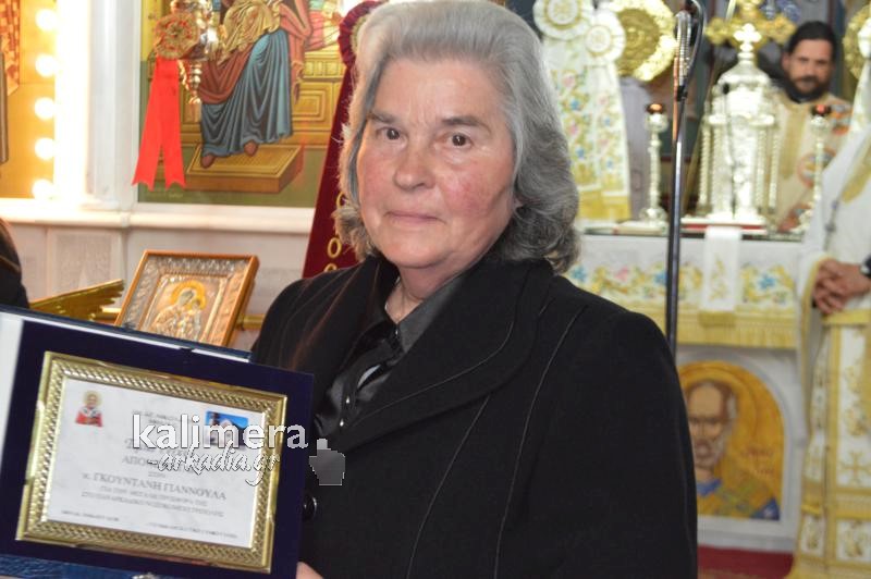 Πρώτη τιμήθηκε η κυρία Γιαννούλα Γκουντάνη που προχώρησε σε μία μυθική προσφορά προς το Παναρκαδικό Νοσοκομείο της Τρίπολης, ενώ δεν ξέχασε και την εκκλησία του Αγίου Νικολάου στο χωριό.