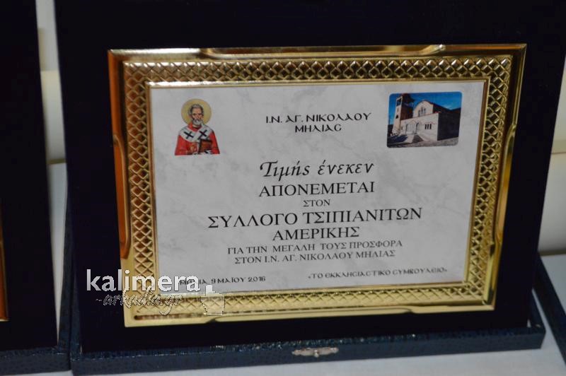Στο πλαίσιο της ίδιας εκδήλωσης, τιμήθηκαν ο Σύλλογος Γυναικών Τσιπιανιτών Αμερικής, ο Σύλλογος Τσιπιανιτών Αμερικής, ο Σύλλογος Τσιπιανιτών Καναδά και στον Αρχιμανδρίτη Ρωμανό Κούσουλα που διακόνησε επί 17 χρόνια στο Ιερό Ναό Αγίου Νικολάου Μηλιάς.