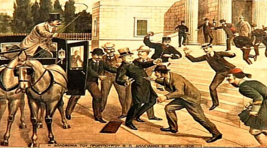 Το απόγευμα της 31ης Μαΐου 1905 ο Θεόδωρος Δηλιγιάννης, ως πρωθυπουργός, πήρε το δρόμο για τη Βουλή, προκειμένου να παραστεί σε μία συνεδρίαση ρουτίνας. Στις 5:05 μ.μ. έφθασε με την άμαξά του στην είσοδο του Βουλευτηρίου, στην οδό Σταδίου, συνοδευόμενος από τον σωματοφύλακά του Γιάννη Πάνο.Ένας άνδρας 35 περίπου ετών προθυμοποιήθηκε να του ανοίξει την πόρτα της άμαξας. Ήταν ψηλού αναστήματος, μαυριδερός, με ρούχα κόκκινα σχεδόν ξεβαμμένα. Ο ανύποπτος Δεληγιάννης τον ευχαρίστησε και κατευθύνθηκε προς τη μαρμάρινη κλίμακα της Βουλής. Τότε, ο άγνωστος με μια αστραπιαία κίνηση έβγαλε ένα μαχαίρι και το βύθισε στην κοιλιά του άτυχου πολιτικού.