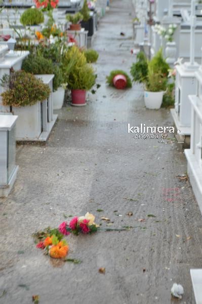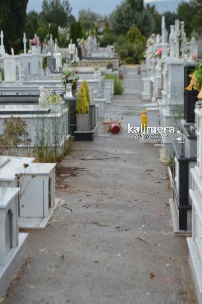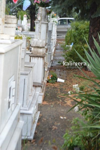 Ο δυνατός αέρας έριξε δένδρα πάνω σε τάφους και έχουν προκαλέσει ζημιές. Ειδοποιήθηκε η υπηρεσία του δήμου και το πρωί της Τετάρτης, η υπηρεσία πρασίνου θα κόψει τα ασπασμένα δένδρα και να καθαρίσει το χώρο γύρω από τους τάφους.