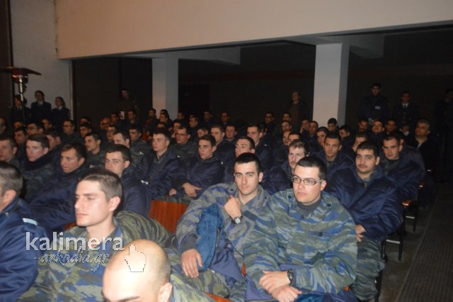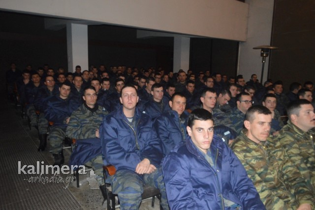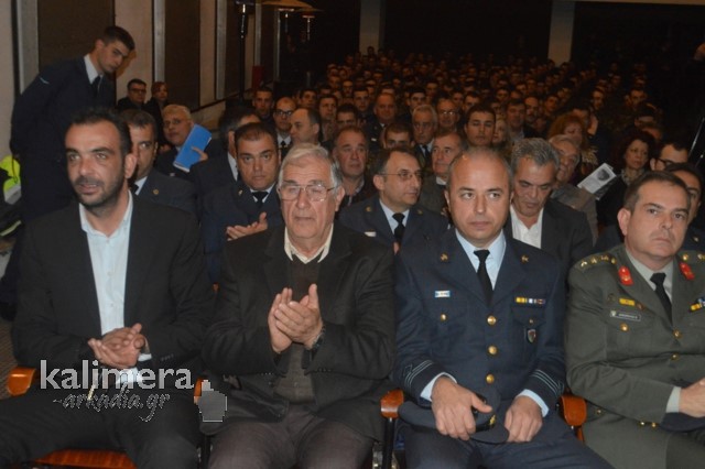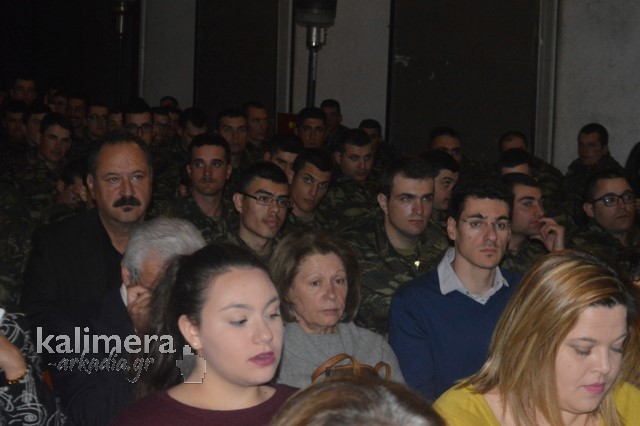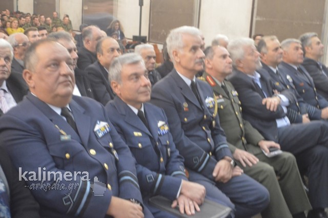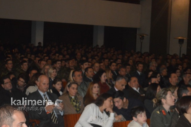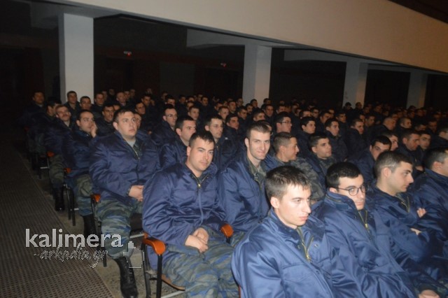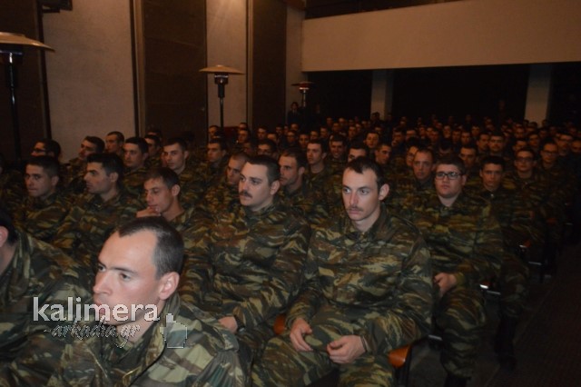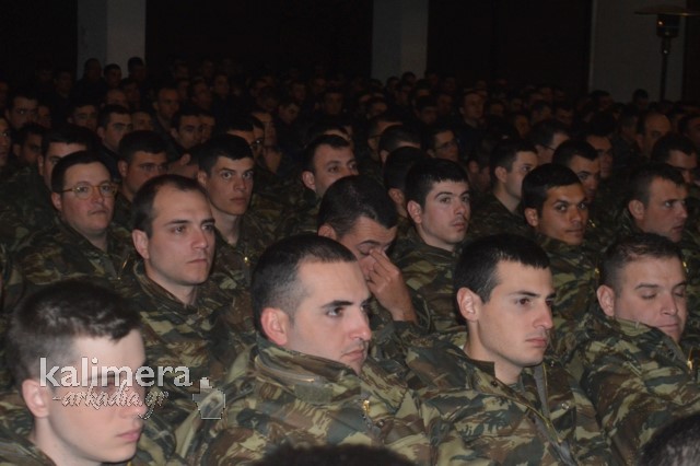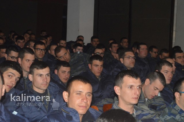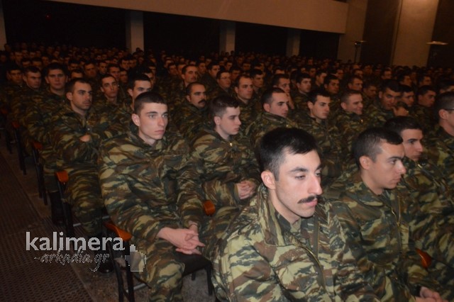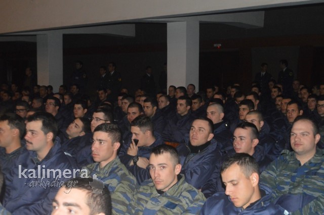Η αίθουσα της εκδήλωσης ήταν γεμάτη από επισήμους, πολίτες, αλλά και νεοσύλλεκτους. Το "παρών" έδωσε ο Δήμαρχος Τρίπολης, Δημήτρης Παυλής, καθώς και πρώην Διοικητές της 124 ΠΒΕ Τρίπολης.