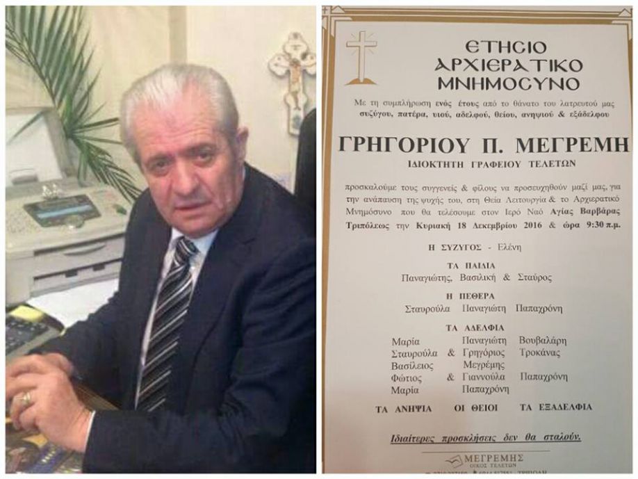 "Ένας χρόνος πέρασε.....και ακόμα δεν έχουμε συνειδητοποιήσει τι έχει γίνει..." έγραψε ο γιος του, Πάνος, στο προφίλ του και ανακοίνωσε ότι το ετήσιο μνημόσυνο θα γίνει την Κυριακή, 18 Δεκεμβρίου, στις 9.30 το πρωί, στο Ναό της Αγίας Βαρβάρας, στην Τρίπολη.