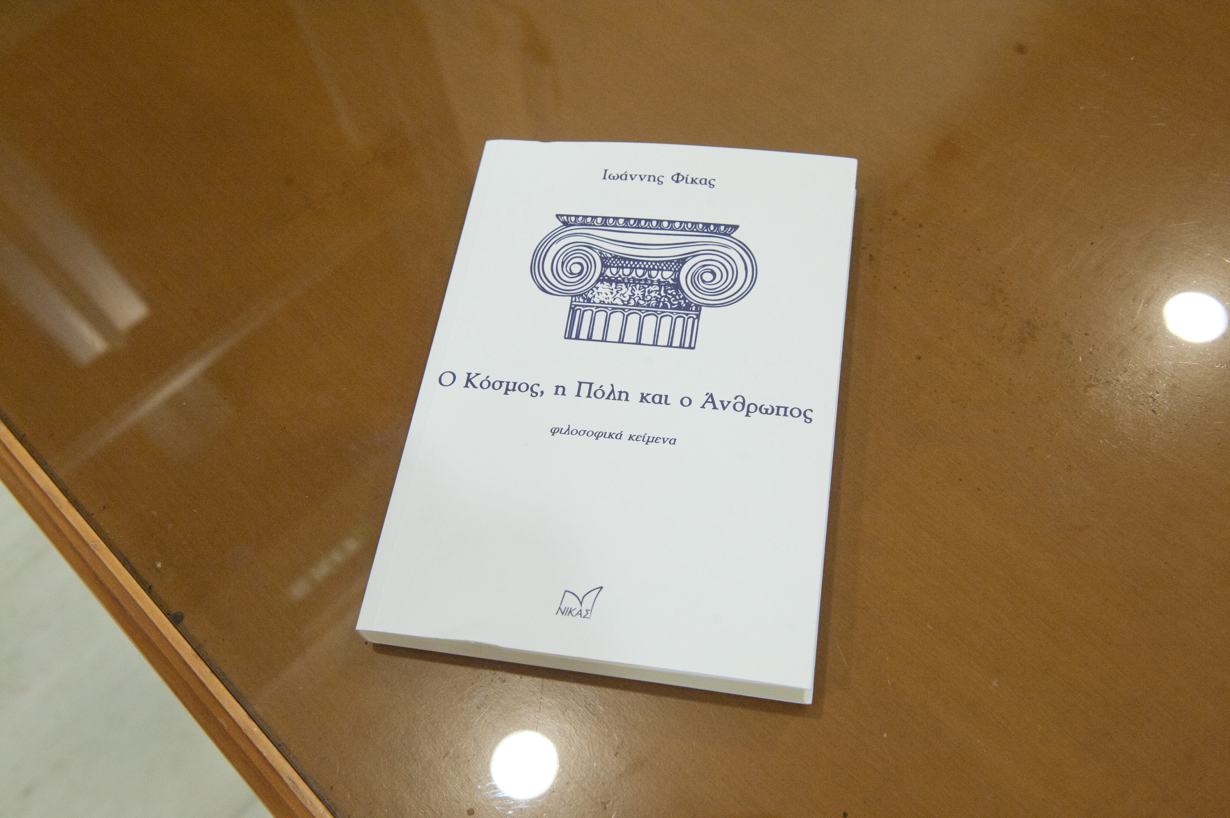 Δεν είναι δύσκολο, κυρίες και κύριοι, να αντιληφθούμε την πορεία που οδήγησε στην πνευματική κυοφορία του νέου βιβλίου του Ιωάννη Φίκα ‘’Ο Κόσμος, η Πόλη και ο ‘Άνθρωπος ‘’ που έχει τον υπότιτλο ‘’Φιλοσοφικά κείμενα ‘’. Πρόκειται για μια διαχρονική συγγραφική άσκηση ύφους και ήθους, μια προσωπική ασκητική ενός σκεπτόμενου και προβληματιζόμενου ανθρώπου και διανοητή. Ο Φίκας διδάσκει, ενημερώνει ,προβληματίζει, καινοτομεί ,ανατρέπει ,προτείνει. Αρνείται την μετριότητα και την απάθεια, δεν συνεργεί με το έγκλημα του εύκολου συμβιβασμού. Τα δέκα κεφάλαια του νέου βιβλίου είναι χαρακτηριστικά. Στο πρώτο γίνεται αναφορά στον Όμηρο, τον Ησίοδο και τους επτά σοφούς, δηλαδή στους πρόδρομους της φιλοσοφικής διανόησης. Ας διαβάσουμε ένα απόσπασμα από την ομηρική αναφορά στην ασπίδα του Αχιλλέα :