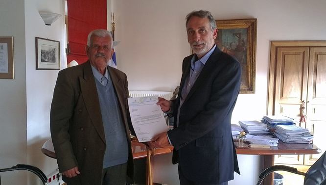 Ο Δήμαρχος Γορτυνίας κ. Γιάννης Γιαννόπουλος ευχαρίστησε τον κ. Σπύρο Σεργόπουλο και τον υποδέχτηκε στο Δημαρχείο Δημητσάνας όπου του παρέδωσε τιμητικό έπαινο για την συνεισφορά του στην επιτυχία του οδοιπορικού και την προβολή της Γορτυνίας.
