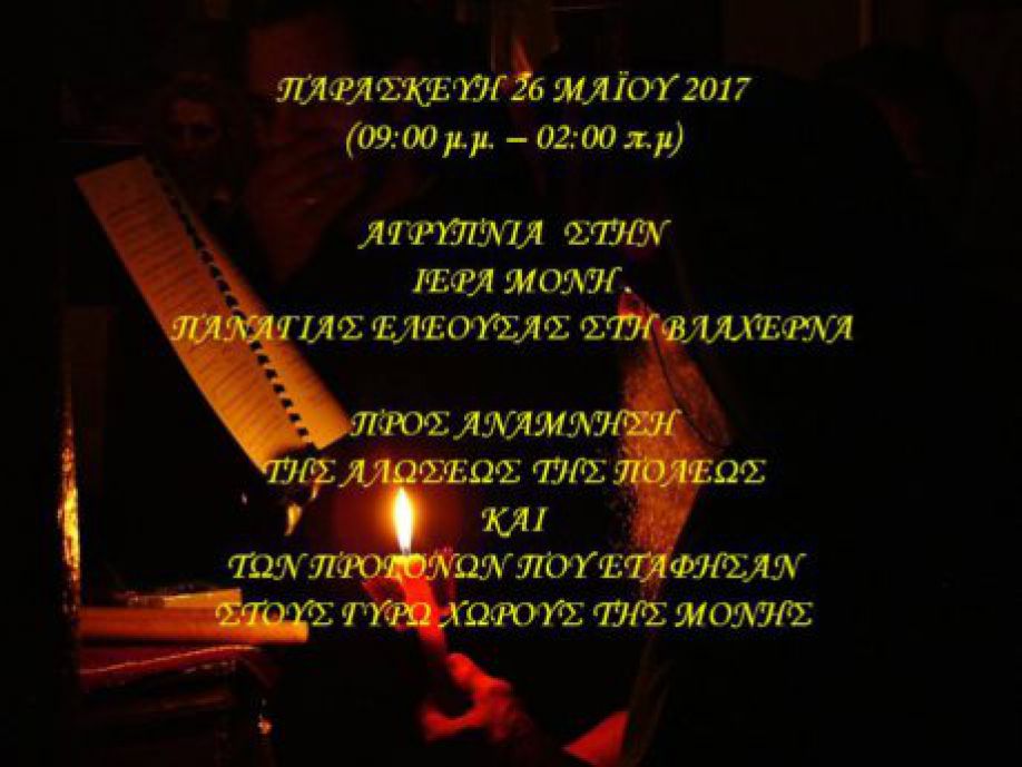 Την Παρασκευή 26 Μαΐου 2017 θα πραγματοποιηθεί στην Ιερά Μονή Παναγίας Ελεούσαςστη Βλαχέρνα η καθιερωμένη αγρυπνία (έναρξη 9:00 μ.μ.), προς ανάμνηση της Αλώσεως της Πόλεως και των προγόνων που ετάφησαν στους χώρους γύρω από τη Μονή όπως και στην Παναγία Καταφυγιώτισσα, όπου έγινε η αποκομιδή των λειψάνων που κατά καιρούς ανεβρέθησαν.