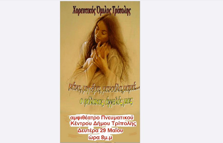 Εκδήλωση προετοιμάζεται από τις παιδικές και εφηβικές ομάδες του Χορευτικού Ομίλου και θα πραγματοποιηθεί τη Δευτέρα 29 Μαΐου και ώρα 8 μ.μ. στο αμφιθέατρο του Αποστολοπούλειου Πνευματικού Κέντρου του Δήμου Τρίπολης.