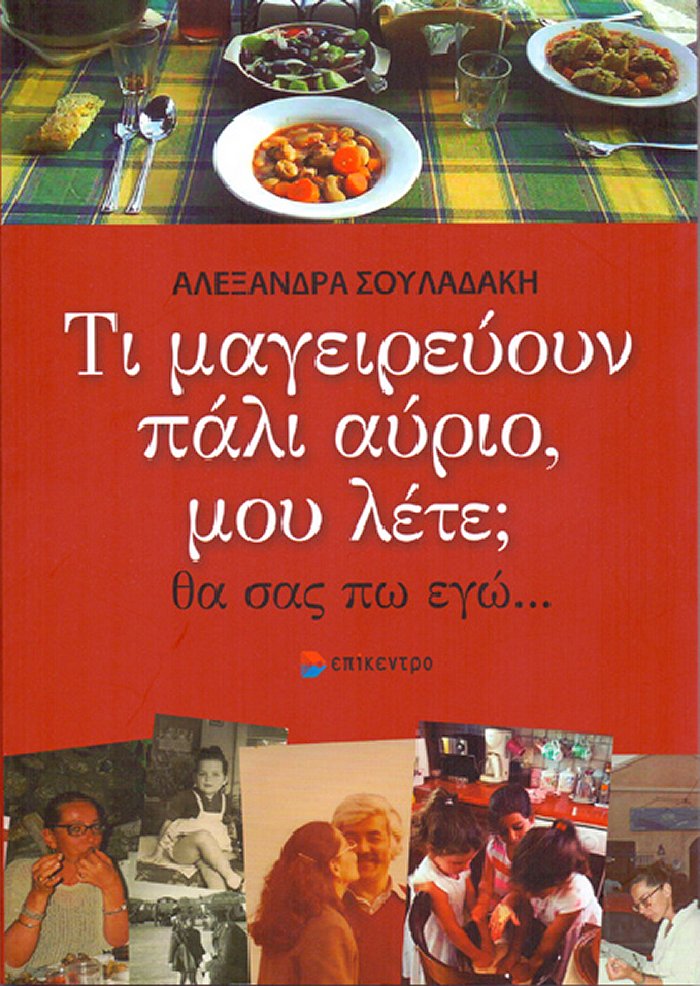 «Τι μαγειρεύουν πάλι αύριο, μου λέτε;… θα σας πω εγώ…». Αυτός είναι ο τίτλος του νέου βιβλίου της Αλεξάνδρας Σουλαδάκη που κυκλοφορεί από τις εκδόσεις «Επίκεντρο» και ήδη έχει παρουσιαστεί σε εκδήλωση που έγινε στο Κολωνάκι.