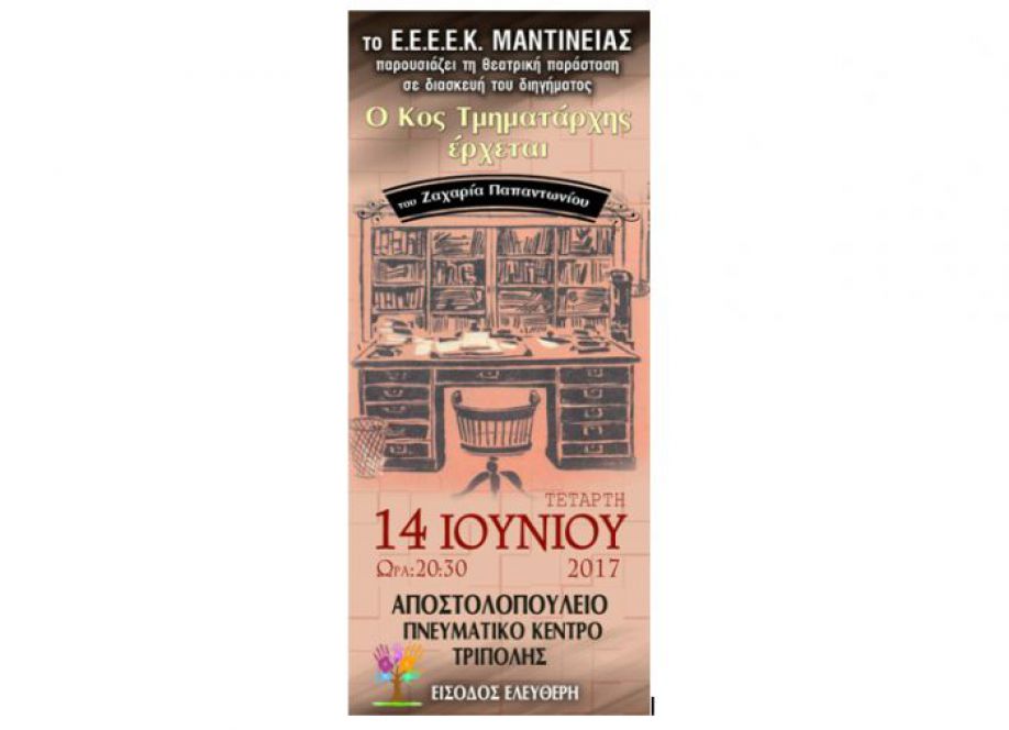 Το Εργαστήριο Ειδικής Επαγγελματικής Εκπαίδευσης και Κατάρτισης (Ε.Ε.Ε.Ε.Κ.) Μαντινείας πραγματοποιεί θεατρική παράσταση την Τετάρτη 14-6-2017 και ώρα 20:30 στο Αποστολοπούλειο Πνευματικό Κέντρο Τρίπολης.