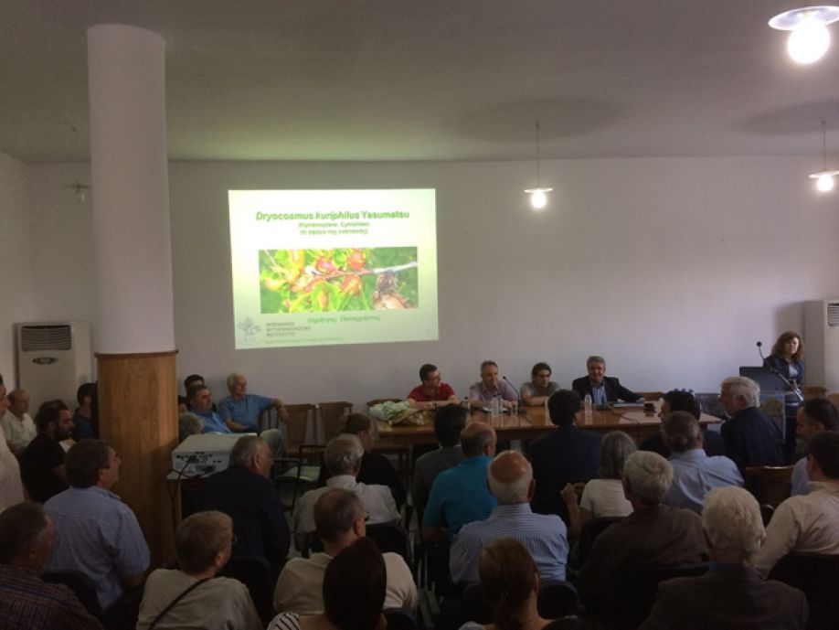 Ο Ερευνητής κ. Δημήτρης Παπαχρήστος από το Μπενάκειο Φυτοπαθολογικό Ινστιτούτο αναφέρθηκε εκτενώς στο έντομο Dryocosmus kuriphilus Yasumatsu (Hymenoptera: Cynipidae) (κν σφήκα της καστανιάς) που είναι ένας από τους σημαντικότερους εχθρούς της καστανιάς. Είναι είδος ιθαγενές της Κίνας το οποίο στην Ευρώπη εμφανίστηκε για πρώτη φορά το 2002 στην Ιταλία και στη χώρα μας το 2014 στην Πιερία. Δημιουργεί κηκίδες σε νεαρούς βλαστούς και φύλλα με αποτέλεσμα να μειώνει την παραγωγή των δένδρων. Η αντιμετώπισή του με καλλιεργητικές πρακτικές όπως είναι μηχανική απομάκρυνση με κλάδεμα των προσβεβλημένων βλαστών πριν την έξοδο των ενηλίκων από τις κηκίδες κρίνεται μη εφαρμόσιμη για μεγάλης κλίμακας προσβολές. Η χημική καταπολέμηση είναι αρκετά δύσκολη έως πρακτικά ανέφικτη. Πέρα από τα φυτικά χαρακτηριστικά της καστανιάς και των καστανεώνων που καθιστούν τις χημικές επεμβάσεις δύσκολες έως αδύνατες και η εν γένει αποτελεσματικότητα τους έναντι του εντόμου είναι χαμηλή. Τα ανήλικα στάδια του εντόμου είναι προστατευμένα εντός των κηκίδων, ενώ η διενέργεια ψεκασμών εναντίον των ενηλίκων του εντόμου αν και θα μπορούσε να μειώσει σε ένα βαθμό τους πληθυσμούς του εντόμου, εντούτοις η επιτυχία τους εξαρτάται από τον ακριβή προσδιορισμό του χρόνου εμφάνισης των ενηλίκων και την πλήρη κάλυψη των δένδρων με το ψεκαστικό υγρό. Θα πρέπει να τονιστεί ότι δεν υπάρχουν εγκεκριμένα εντομοκτόνα για το συγκεκριμένο έντομο στη χώρα μας.