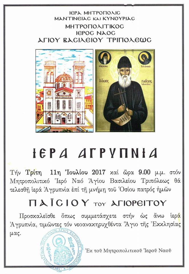 Τὴν Τρίτη 11 Ἰουλίου 2017 καὶ ὥρα 9.00 τὸ βράδυ, στόν Μητροπολιτικὸ Ἱερὸ Ναὸ Ἁγίου Βασιλείου Τριπόλεως τελέσθηκε ἱερὰ Ἀγρυπνία, ἐπὶ τῇ μνήμῃ τοῦ Ὁσίου πατρὸς ἡμῶν Παϊσίου τοῦ Ἁγιορείτου.