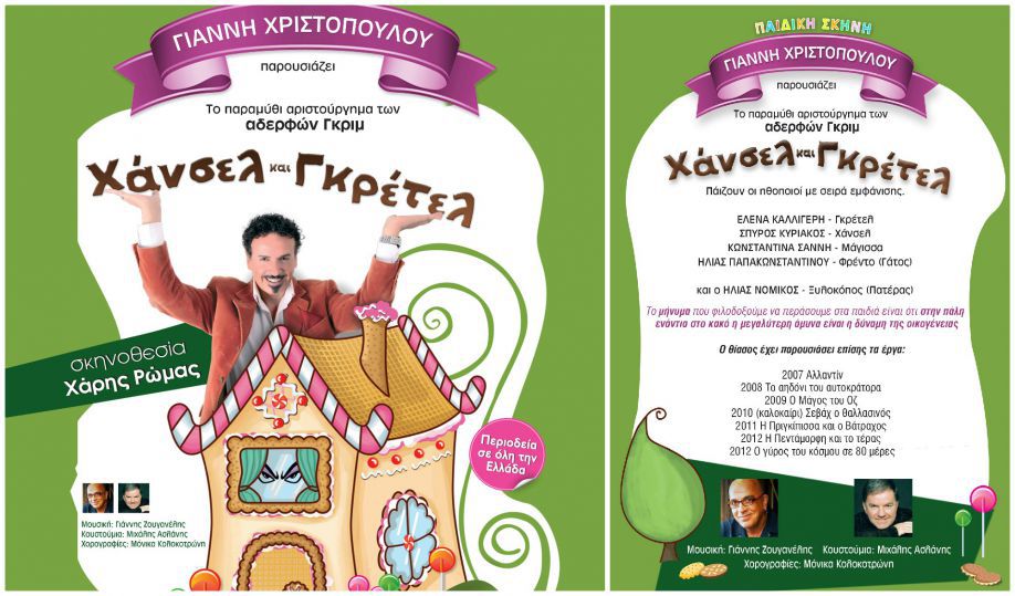 Η παιδική σκηνή του Γιάννη Χριστόπουλου παρουσιάζει το γνωστό παραμύθι "ΧΑΝΣΕΛ & ΓΚΡΕΤΕΛ", ένα από τα ωραιότερα παραμύθια που έχουν γράψει οι κορυφαίοι του είδους ΑΔΕΡΦΩΝ ΓΚΡΙΜ!
