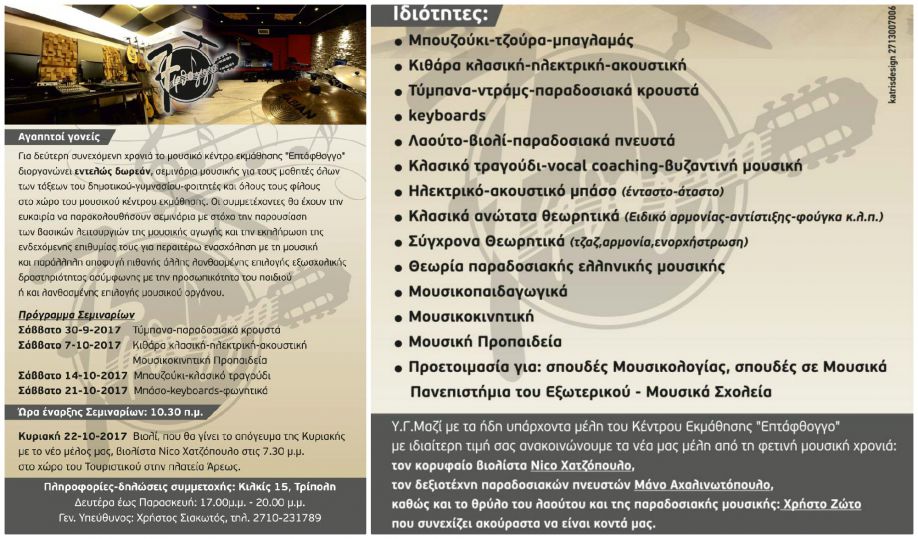 Το Μουσικό Κέντρο Εκμάθησης ''7φθογγο'' σας προσκαλεί για 2η συνεχόμενη χρονιά σε έναν ακόμα κύκλο σεμιναρίων, που θα πραγματοποιηθούν στο χώρο του κέντρου στην οδό Κιλκίς 15 στην Τρίπολη!