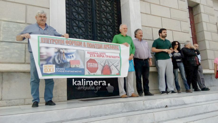 Για δεύτερη συνεχόμενη Τετάρτη, η Επιτροπή Φορέων και Πολιτών Αρκαδίας οργάνωσε συγκέντρωση διαμαρτυρίας ενάντια στους πλειστηριασμούς, στο Ειρηνοδικείο Τριπόλεως, μέρα κατά την οποία ήταν προγραμματισμένοι να γίνουν δύο πλειστηριασμοί ακινήτων.