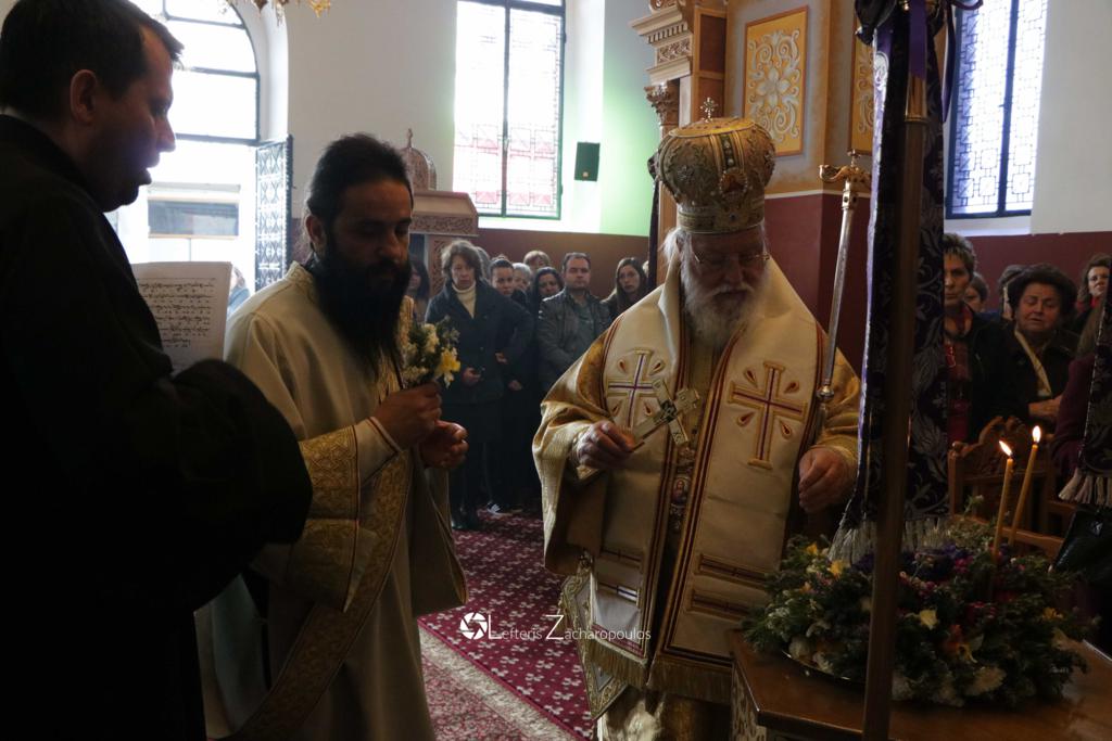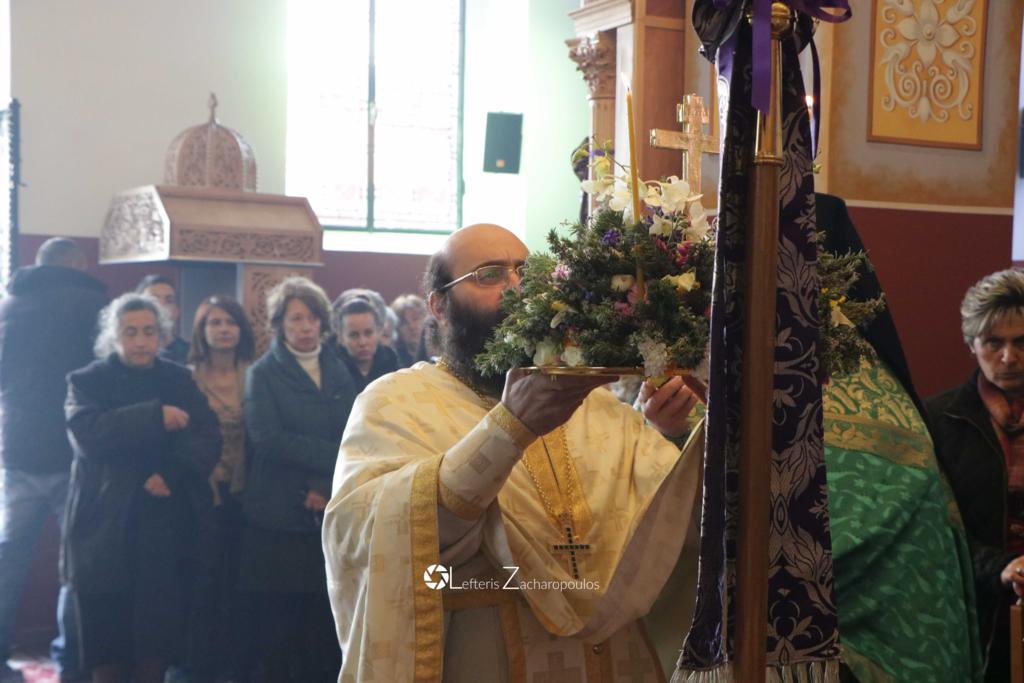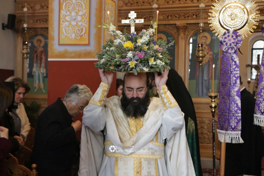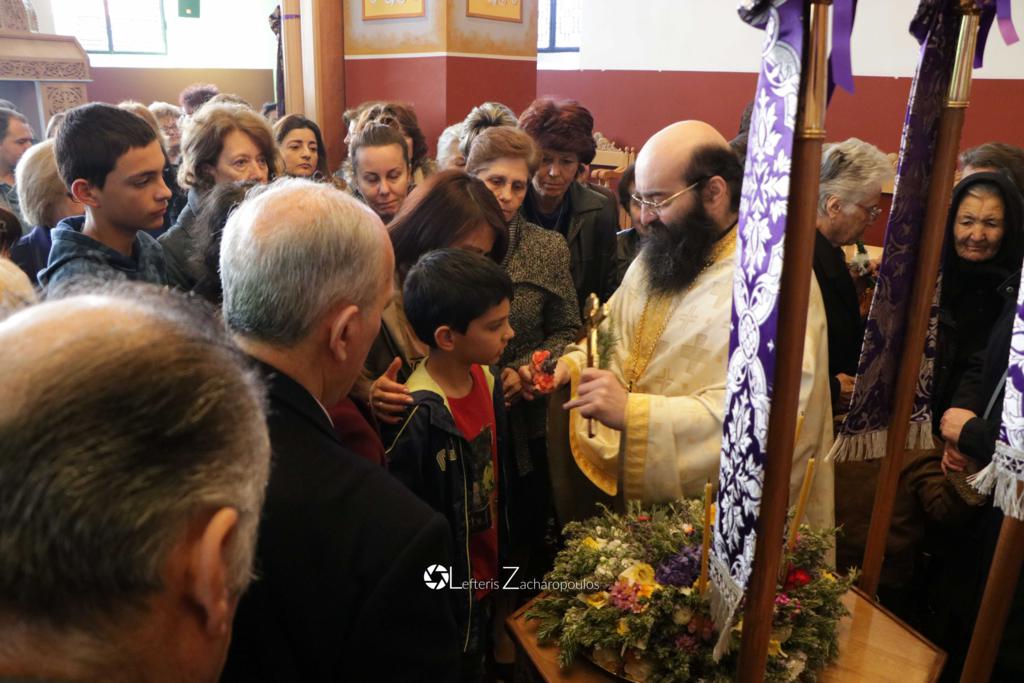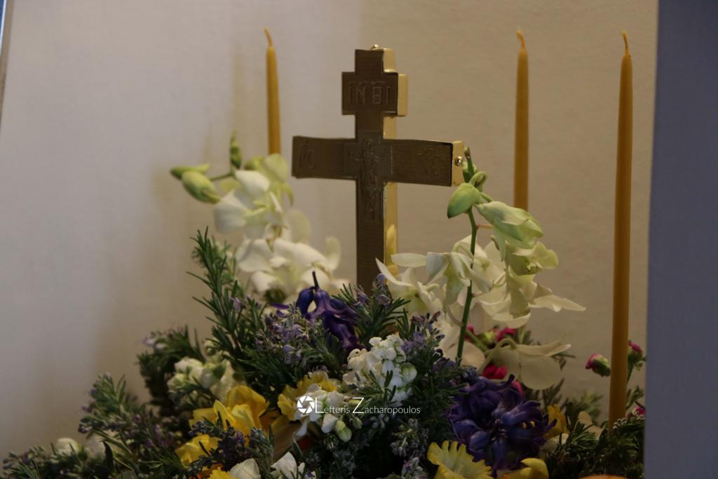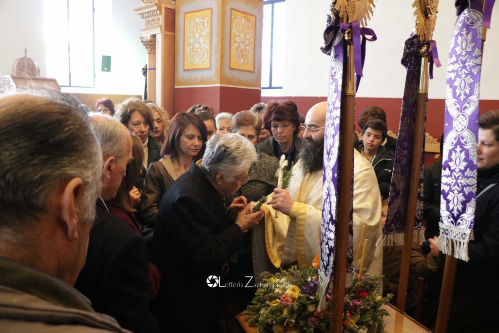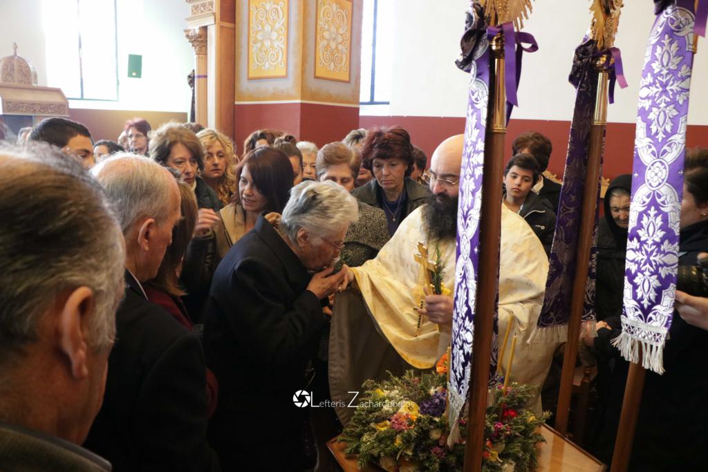 Οἱ ἐκκλησιαζόμενοι ἀσπάζονται τόν τίμιο Σταυρό καί λαμβάνουν ἀπό τά χέρια τοῦ Ἱερέως εὐλογία ἀπό ἄνθη καί δεντρολίβανο.