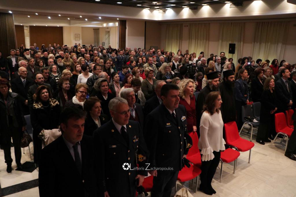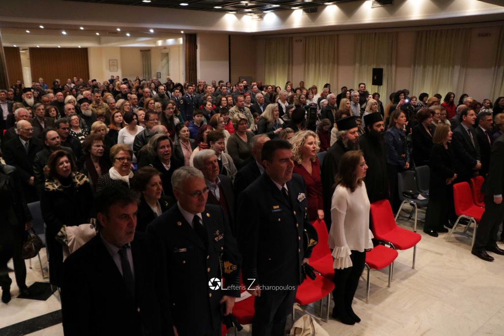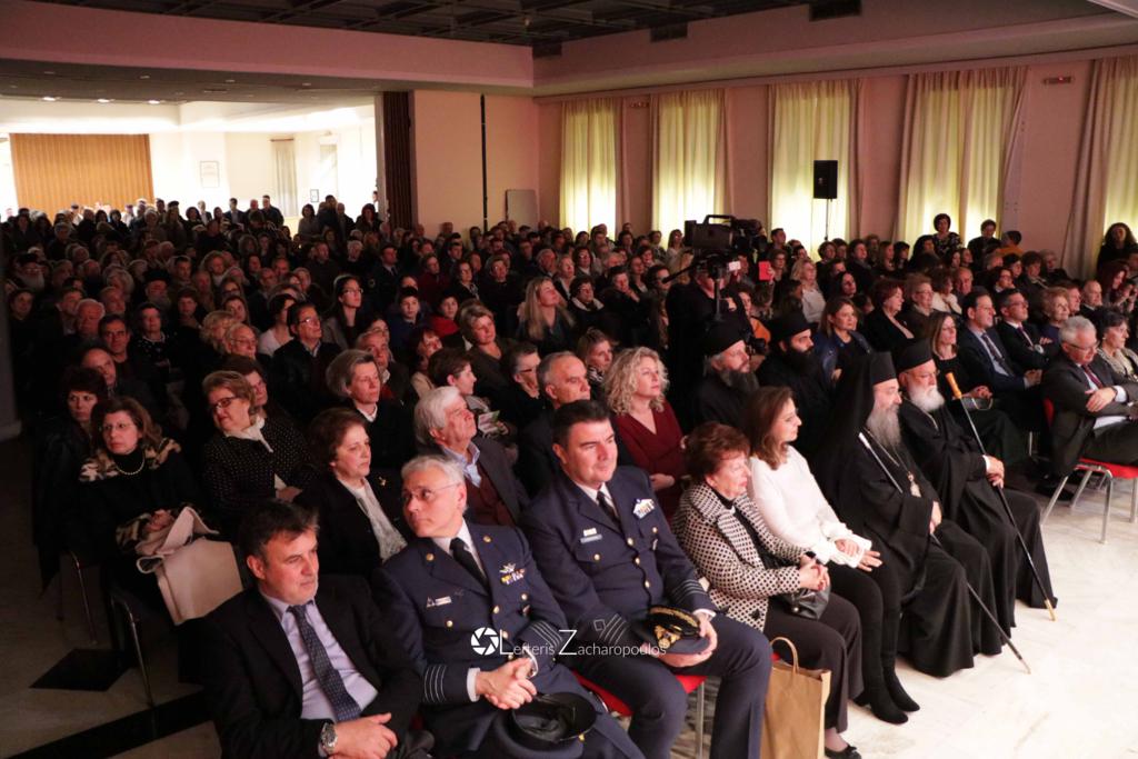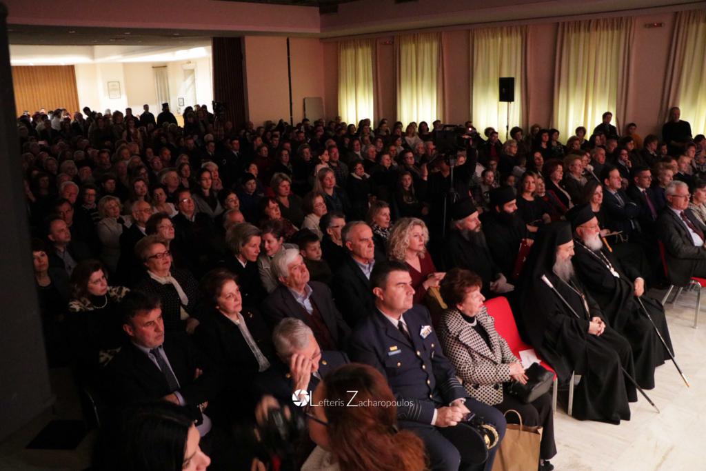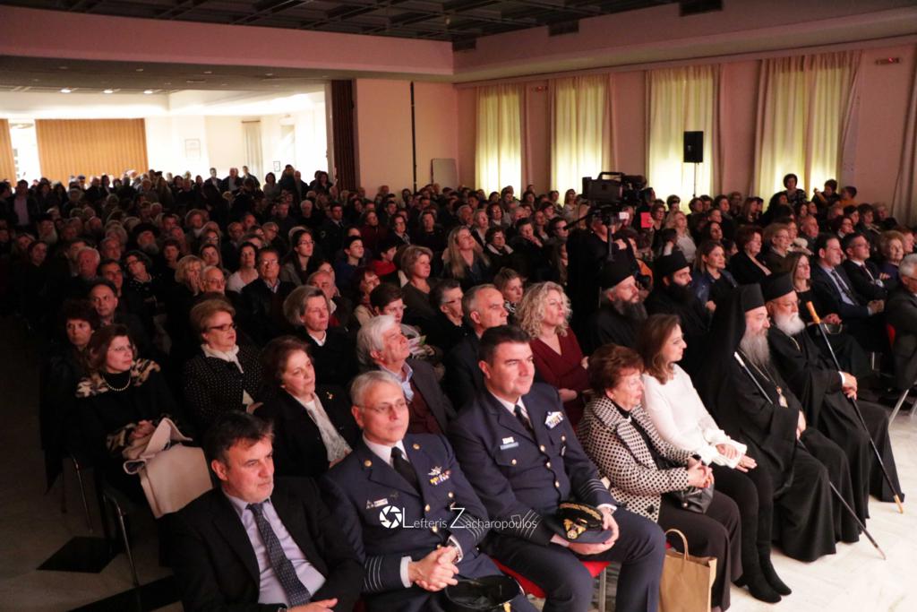 Στήν κατάμεστη αἴθουσα τοῦ Πνευματικοῦ Κέντρου, ἐκτός τοῦ Λαοῦ τῆς Τριπόλεως, προσῆλθαν ἐπίσημοι καί ἐκπρόσωποι τῶν πολιτικῶν καί στρατιωτικῶν ἀρχῶν.