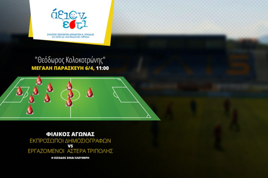 Το πρωί της Μεγάλης Παρασκευής στις 11:00, θα πραγματοποιηθεί στο γήπεδο του ΑΣΤΕΡΑ ο αγώνας που έχει απώτερο σκοπό την ενίσχυση του Συλλόγου Εθελοντών Αιμοδοτών Αρκαδίας για παιδιά με Νεοπλασματικές Ασθένειες (Αξιον Εστί).