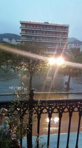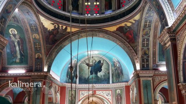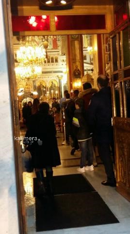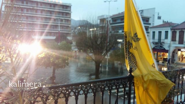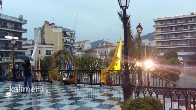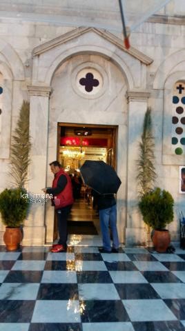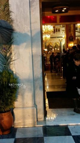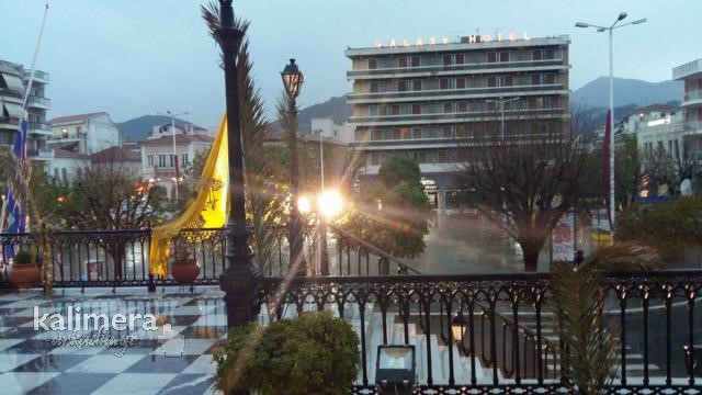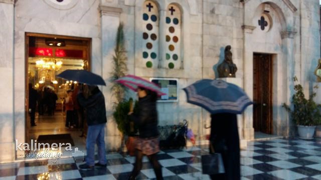 Μεγάλη Παρασκευή στην Τρίπολη και κατά διαστήματα η βροχή ήταν πολύ δυνατή. Οι πιστοί, με ομπρέλες και κουκούλες, ανεβαίνουν τα σκαλιά του Μητροπολιτικού Ναού του Αγίου Βασιλείου για να προσκυνήσουν τον Επιτάφιο που έχει ως θέμα τον "Πανάγιο Τάφο".