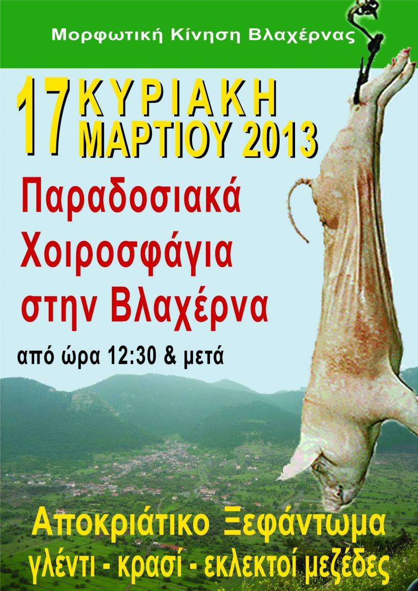 Την Κυριακή 17/03/2013 και ώρα 12:30 το μεσημέρι, η Μορφωτική Κίνηση Βλαχέρνας, στα πλαίσια των λαϊκών παραδόσεων και εθίμων του χωριού μας, αναβιώνει και φέτος τα παραδοσιακά «χοιροσφάγια-γουρουνίσματα»