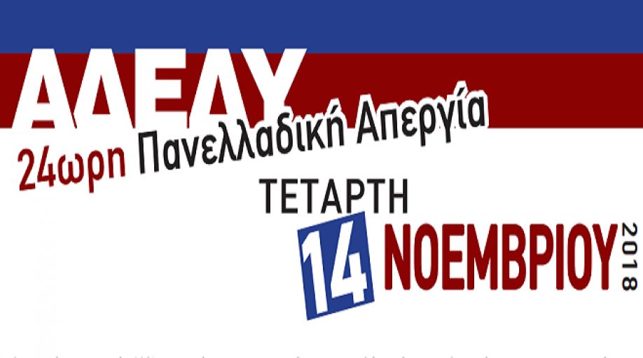 Η Ε.Λ.Μ.Ε. Αρκαδίας συμμετέχει στην 24ωρη πανελλαδική απεργία την Τετάρτη 14 Νοέμβρη 2018. Απεργιακή συγκέντρωση θα γίνει εκείνη τη μέρα στην Πλ. Κλαυθμώνος, ώρα 11:00πμ.
