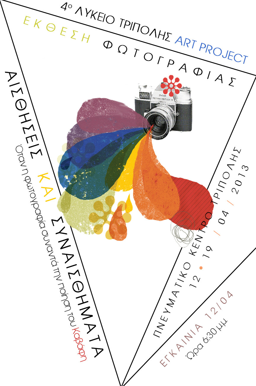 Οι μαθητές και οι καθηγήτριες του Art Project του 4ου Λυκείου Τρίπολης, προσκαλούν στα εγκαίνια της έκθεσης «Αισθήσεις και Συναισθήματα, όταν η φωτογραφία συναντά την ποίηση του Καβάφη» την Παρασκευή 12 Απριλίου 2013, στις 6:30 μ.μ. στο Πνευματικό Κέντρο Τρίπολης.