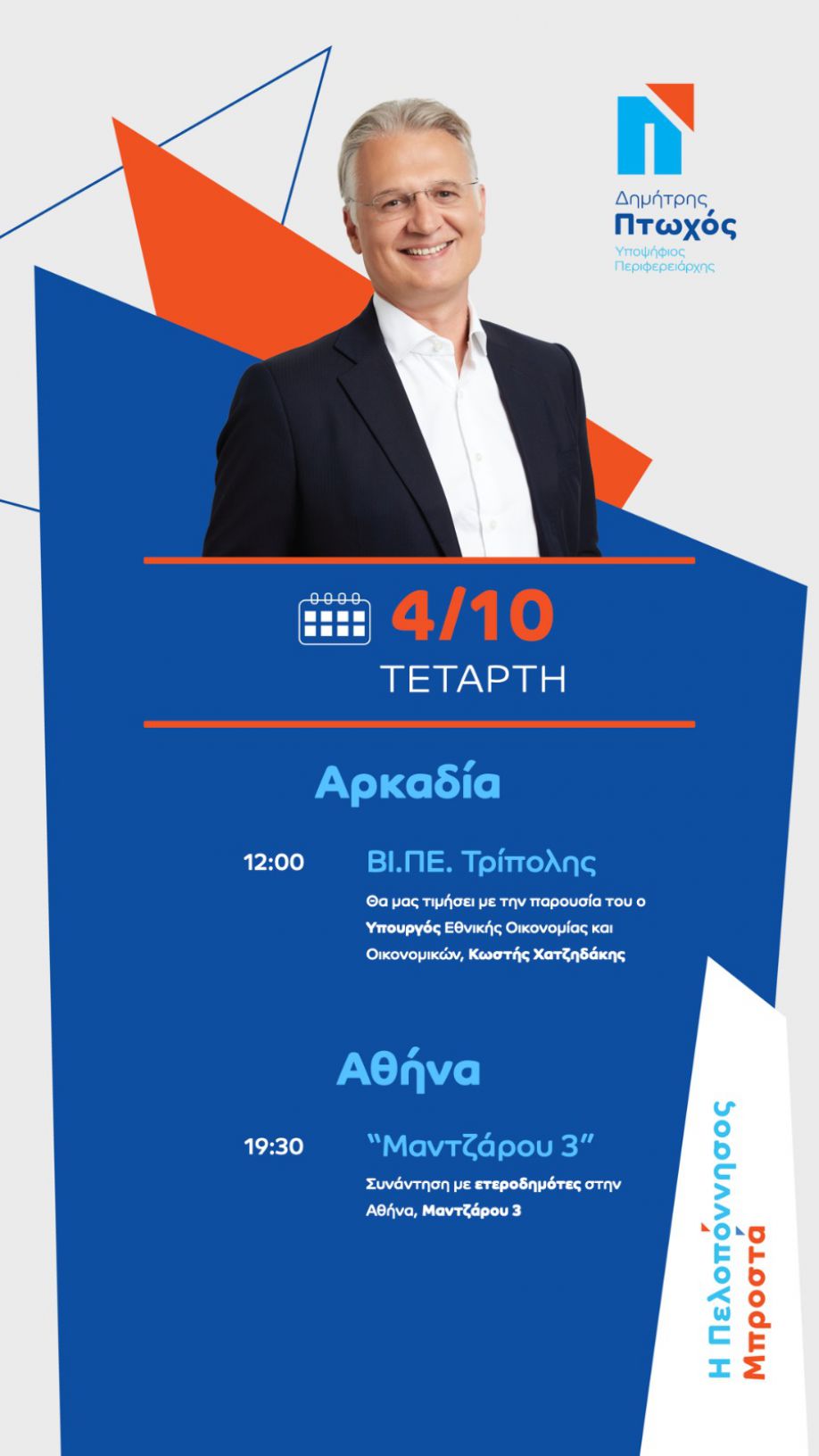 Ο υποψήφιος Περιφερειάρχης Πελοποννήσου Δημήτρης Πτωχός αύριο Τέταρτη 4 Οκτωβρίου, θα επισκεφτεί: