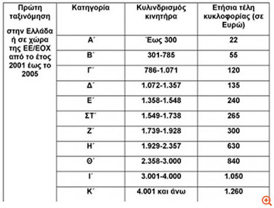 Σε ό,τι αφορά στα υπόλοιπα οχήματα, δηλαδή αυτά που έχουν ταξινομηθεί έως τις 31 Οκτωβρίου 2010 και τα τέλη υπολογίζονται με βάση τον κυβισμό και το έτος ταξινόμησης, δεν αναμένονται αλλαγές. Τα τέλη κυκλοφορίας για αυτά τα ΙΧ έχουν ως εξής: