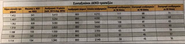 Οι συνταξιούχοι ΔΕΚΟ και τραπεζών έχουν λαμβάνειν (ενδεικτικά) ως 6.770 ευρώ συνολική επιστροφή από παράνομες μειώσεις κύριων και επικουρικών συντάξεων για 10 και 12 μήνες αντίστοιχα. Αν δοθούν τα αναδρομικά σε 36 δόσεις θα έχουν μηνιαίες αυξήσεις σε κύρια και επικουρική, από 90 ευρώ το μήνα ως και 188 ευρώ το μήνα. Αν οι επιστροφές γίνουν σε 60 δόσεις, οι μηνιαίες αυξήσεις συντάξεων είναι από 55 ως 113 ευρώ το μήνα.