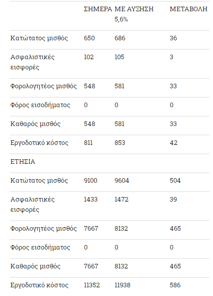 Ο πίνακας που δημοσιεύεται, συνοψίζει τις αλλαγές που θα επέλθουν αν επιβεβαιωθεί το σενάριο για αύξηση του κατώτατου μισθού κατά 5,6% δηλαδή με ρυθμό διπλάσιο της προσδοκώμενης αύξησης του ΑΕΠ (αν και το ποιο πιθανό είναι να χρησιμοποιηθεί η ανάπτυξη του 2019 δεδομένου ότι μέχρι τον Ιούνιο δεν θα υπάρχει εικόνα για την φετινή χρονιά). Σε κάθε περίπτωση, μια τέτοια κίνηση έχει τις εξής επιπτώσεις: